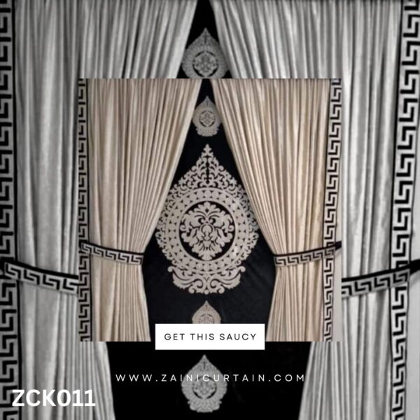 COLOR THEME: BLACK RUSTY PELMET LASER WORK CURTAIN AND DARK BLACKOUT BLACK BLIND WITH VERSACE BRAND ON LASER WORK SEPARATED LASER BORDER WITH RIGHT OR LEFT SIDE OF VERSACE BRAND.