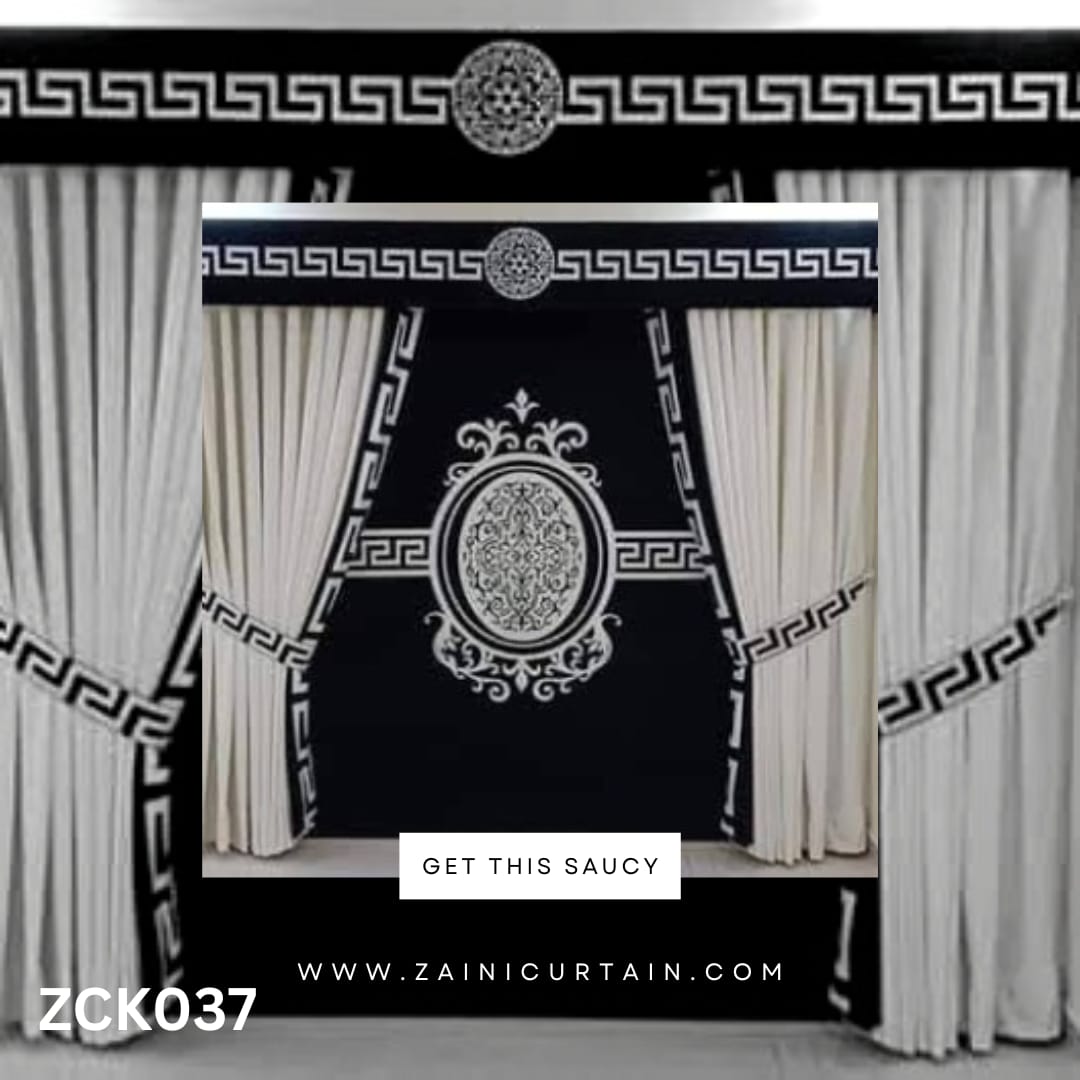COLOR THEME: SANDALWOOD PELMET WITH LASER WORK, WHITE CURTAIN, AND BLACKOUT BLACK BLIND WITH VERSACE BRAND CENTER BUNCH SEPARATED LASER BORDER ON RIGHT OR LEFT SIDE OF CURTAIN