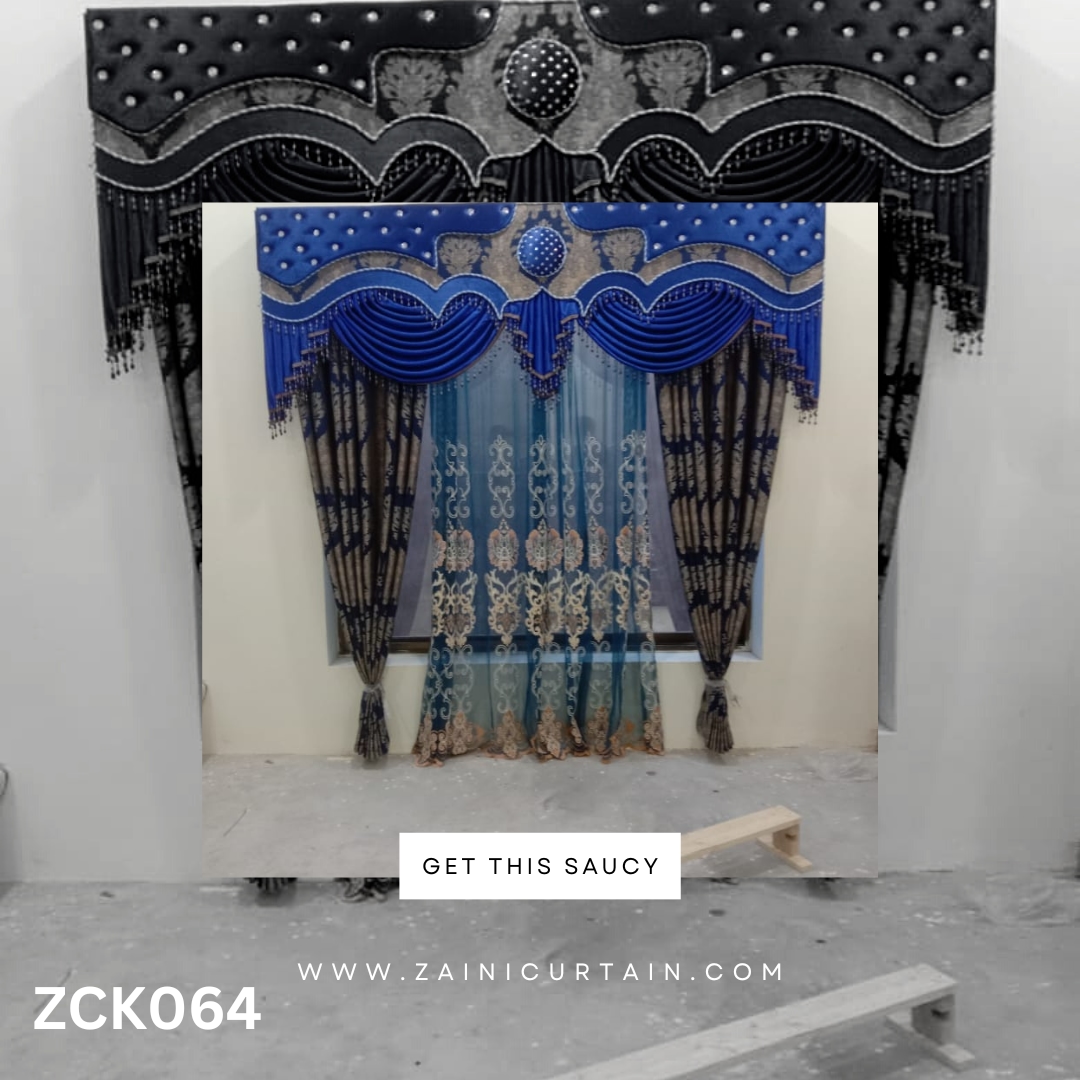 COLOR THEME: BLUE PELMET & DARK BROWN CURTAINS, SHEER EMBROIDERED BLUE BLINDS