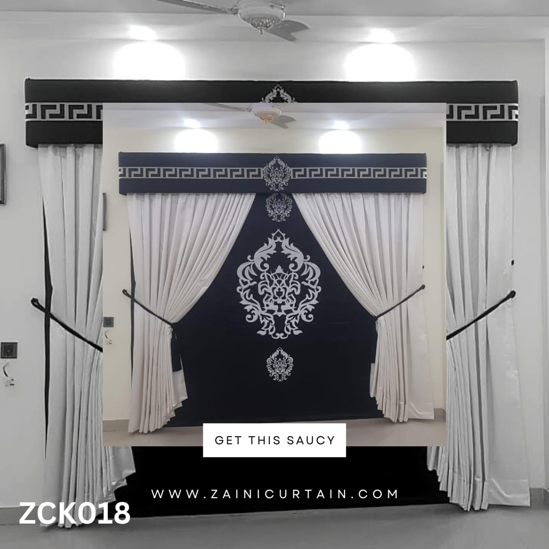 COLOR THEME: BLACK AND WHITE CURTAINS AND BLINDS WITH LASER WORK CENTER BUNCH ON BLINDS AND PELMET.