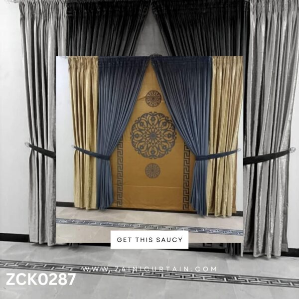 COLOR THEME: GREY AND SKIN CURTAINS AND BLINDS WITH LASER WORK CENTER BUNCH ON BLINDS AND PELMET.